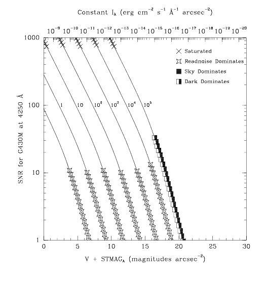 Figure 13.16: Diffuse Source Signal-to-Noise as a Function of STMAG for G430Mvalues corresponding to the STMAG units (V+STMAG