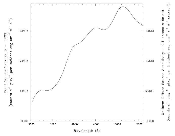 Point source sensitivity assumes full transmission (zero slit losses). Diffuse source sensitivity assumes a 0.1" wide slit. To convert point source sensitivities to diffuse source sensitivities multiply the point source values by the grating spatial (cross dispersion) plate scale in units of arcseconds per pixel and by the width of the desired slit in units of arcseconds.