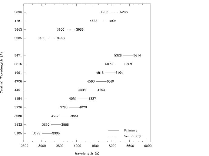 G430Lgrating, theG430Mgrating is used with the CCD and has a spectral range from 3020-5600 Å.Since a single exposure taken with this grating covers only 286 Å the grating must be scanned, with a series of exposures taken at 10 distinct settings, to cover the full spectral range of the grating.