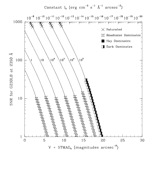 Figure 13.20: Diffuse Source Signal-to-Noise as a Function of STMAG for G230LBvalues corresponding to the STMAG units (V+STMAG