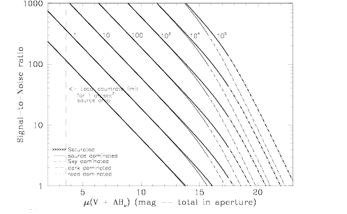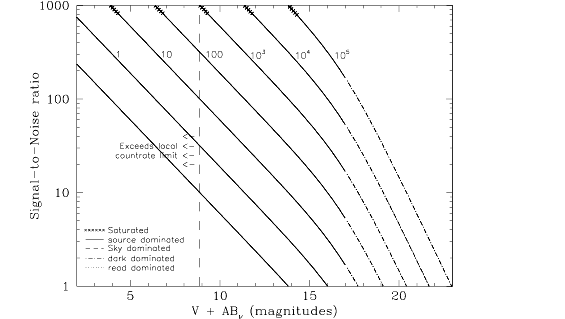 Figure 14.29: Point Source S/N vs. V+ABfor the F25ND3 NUV-MAMA mode. Top curves are for DARKTIME. Bottom curves are for average sky. Top curves are for DARKTIME. Bottom curves are for average sky. Curves are labeled by required exposure time (sec).