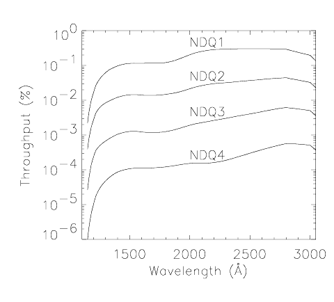 F25NDQmode with the NUV-MAMA detector provides broad band imaging with attenuation factors varying between 10-1 and 10-4. The full field of view is 25 X 25 arcsec, but theF25NDQfilter is unique in that it is divided into four quadrants, each having a different neutral density factor. In clockwise order starting from the upper left these areF25NDQ1,F25NDQ2,F25NDQ3, andF25NDQ4, where the number appended to each name is the approximate dex ND factor. The R80 and central pixel flux are unmeasured but assumed to be approximately the same as produced by theF25SRF2filter.Recommended Uses