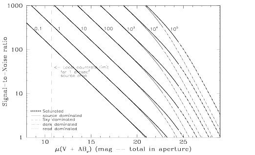 Figure 14.37: Extended Source S/N vs. V+ABfor the F25QTZ NUV-MAMA mode. Top curves are for an area of 0.2 arcsec2; bottom curves are for 1 arcsec2. Average sky assumed. Curves are labeled by required exposure time (sec).