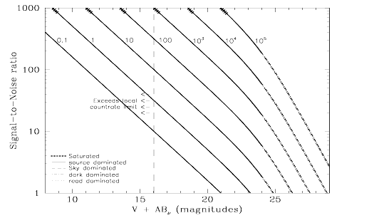 Figure 14.36: Point Source S/N vs. V+ABfor the F25QTZ NUV-MAMA mode. Top curves are for DARKTIME. Bottom curves are for average sky. Curves are labeled by required exposure time (sec).