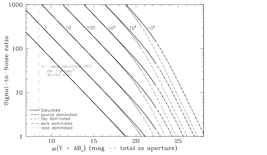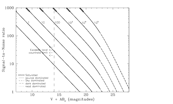 Figure 14.62: Point Source S/N vs. V+ABfor the F25CN182 NUV-MAMA mode. Curves are labeled by required exposure time (sec).
