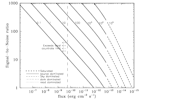 Figure 14.89: Point Source S/N vs. flux for the F25LYA FUV-MAMA mode. Curves are labeled by required exposure time (sec).