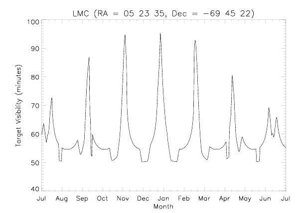 This plot shows the number of days each spacecraft orientation is schedulable during the cycle. The cycle is assumed to start on July 1 and end on June 30.