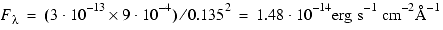Given a source with a flux of 0.9mJy at 1350Å, convert this flux to erg s-1cm-2Å-1. From section 3, Table B.1, we see that the conversion constant is 3×10-13 and the wavelength is 1350Å = 0.135µm. Thus: