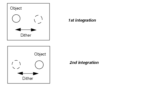 For compact objects, such as point sources, background subtraction can be achieved by moving the target across the camera field of view (see Figure D.1). A dither pattern, which involves movements of a few arcsec from one exposure to the next, can then be used. This is an efficient way to build background images, since the target is present in each exposure, and a background image can be created from the stacking and filtering of all exposures.