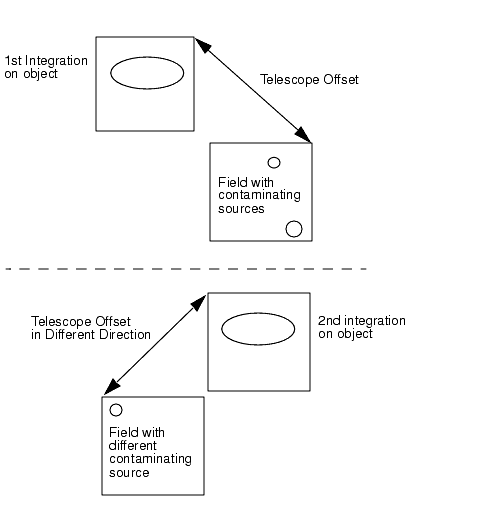 For an extended object, which occupies a significant portion of the NICMOS field of view (star fields, nebulae, galaxies), the dithering technique cannot be applied to build background images. In this case, offsets to an adjacent field (chopping) chosen to be at least one camera field away in an arbitrary (or user specified) direction, are necessary. By offsetting in different directions, a stacked and filtered sky image can be created which removes the effect of contaminating objects in the offset fields (see Figure D.2). As in the case of compact objects, these offsets might be quite small, but for large galaxies for example, they may need to be over considerable distances. The user has the ability to specify the offset value, directions, and the number of offsets in the Phase II pattern parameter specification.