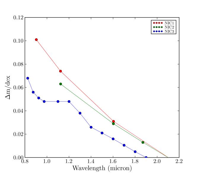 The NICMOS team had determined that NICMOS has a significant count rate dependent non-linearity that also depends on wavelength. This is a different nonlinearity from the well-known total count dependent non-linearity. The non-linearity amounts to 0.05-0.10 mag offset per dex change in incident flux for the shortest wavelength (F090M and F110W), about 0.03 mag/dex at F160W and less than that at longer wavelengths (see Figure 4.4). Objects fainter than the NICMOS standard stars of about 12th magnitude will be measured too faint, objects that are brighter than our standards will seem too bright. The effect depends entirely on the incoming flux rate, so any objects fainter than the night sky (or on top of a bright object) will have a non-linearity offset determined by the background flux. This means that the maximum offsets on dark sky backgrounds at F110W are about 0.25 mag in NIC1 and NIC2, and about 0.16 mag in NIC3. Software has been developed to linearize the counts in imaging observations. More details on the effect and how to correct for it can be found at: