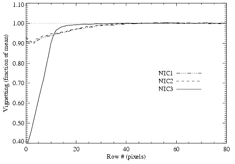 In addition to focus degradation, NIC3 is also affected by vignetting from two sources. The first is a cold vignetting, due to the lateral shift of the FDA mask, similar to the vignetting affecting NIC1 and NIC2. The second is due to a warm bulkhead edge, which produces elevated thermal background and degraded image quality over the bottom 25% of the detector (bottom ~60 rows).