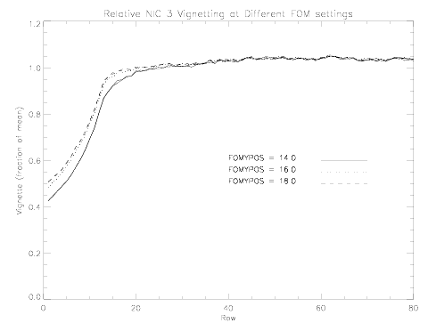 The only vignetting left in NIC3 with the FOM at Y=+16 arcsec is the one produced by the FDA and affects the bottom 10-15 rows of the detector, in the same manner as NIC1 and NIC2. NIC3 is now operated with the FOM at the +16 arcsec position as default. The loss in throughput is shown in Figure 4.14.
