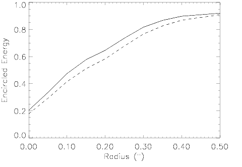 Because NIC3 undersamples the PSF, the degradation of image quality with the PAM mirror at -9.5 mm was found to be relatively small compared to the optimal-focus image quality. Figure 4.13 shows the encircled energy for NIC3 at 1.6 microns for both the optimal focus (PAM=-12 mm at the time of the measurement) and the best focus (PAM=-9.5 mm). Both curves report simulations obtained with TinyTim PSFs convolved with the NIC3 pixel response, but the results are very similar to the actual observations. The loss in the peak flux is around 20% and the loss in encircled energy beyond one pixel radius (0.2") is no more than 10-15%. Given the minimal loss of performance with the slight out-of-focus operations, NIC3 will be operated without moving the HST secondary mirror and will be offered "as is" in future Cycles.