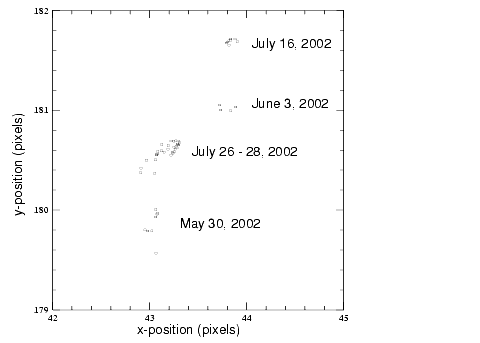 The NICMOS dewar anomaly caused the coronagraphic hole to migrate to different locations on the detector, during Cycle 7 and 7N. The position of the hole on the detector had been observed to move as much as ~0.25 pixel in three orbits. During the interval April-December 1998, the hole moved about 1 pixel. The movement of the hole is not linear. Rather, the hole "jitters" back and forth along an X-Y diagonal by as much as ±0.5 pixel. The movement of the hole during Cycle 11 is presented in Figure 5.3. The coronagraphic hole has moved, on average, half a pixel per day.