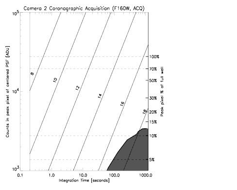The observer needs only to specify a NICMOS onboard Acquisition (ACQ) to acquire the target. The software schedules the background and flat field observations first, followed by the observations of the target. The exposure times for the pointed background and flat field observations are 7.514 seconds. As an aid to coronagraphic observers, Figure 5.4 presents a plot of counts in the peak pixel for a centered point source obtained with the F160W filter as a function of integration time. The right-hand axis indicates the percentage of full-well for that peak pixel. The true responses of the pixels where the target falls within the FOV will vary. Thus 70% full well should be a reasonably conservative goal for the peak counts needed for a successful acquisition. Over plotted on the figure are diagonal lines which indicate the counts in the peak pixel of a PSF for H-band magnitudes from 8 to 18 (labeled). The shaded region in the lower-right indicates a domain where relatively hot pixels' dark current will result in more counts than faint point-sources, which will cause the acquisition to fail.