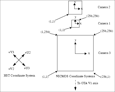 Figure 6.1 shows how the NICMOS cameras are arranged in the HST field of view. The alignment of each camera is not exact, and the internal coordinate systems attached to each of them differ by small rotations (< 1 degree). The FITS format data files generated for NICMOS observers will have a World Coordinate System specified appropriately for each camera. The adopted coordinate system for all three cameras is summarized in Figure 6.1.