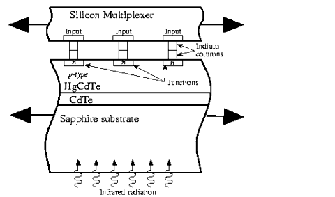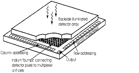 In order to produce an "imaging" detector, a large number of such unit cells, or pixels, are combined into an array. The photon-sensitive layer (HgCdTe in the case of NICMOS3 detectors) and the Si-multiplexer (which contains the array of FETs) are combined in a "hybrid" structure, connected via tiny indium bumps ( Figure 7.3). For better mechanical stability, the "hybrid" array structure is put on an infrared-transparent Sapphire substrate. Since each pixel contains its own FET, there is no "bleeding" along columns, as in CCD chips, and bad pixels do not block the rest of the column.