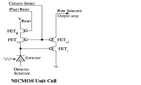 An infrared detector is basically a photodiode, the core of which is a p-n-junction created during the wafer processing. The Fermi-levels of the p- and n-type materials, i.e. the highest occupied energy state of the electron gas within the semiconductor material, must match, which effectively creates an electric field across the junction. The incident infrared photons free electron-hole pairs into the conductance band at or near the junction which are immediately separated by the electric field. The accumulated charge carriers cause a voltage change across the junction which can be detected and used as a measure of the incident light. One can think of the detector as a capacitor that is discharged by the infrared photons. In practice, the voltage change is monitored by a Si field effect transistor (FET), used as a source follower amplifier. Figure 7.2 shows the equivalent circuit diagram for the NICMOS3 "unit cell".