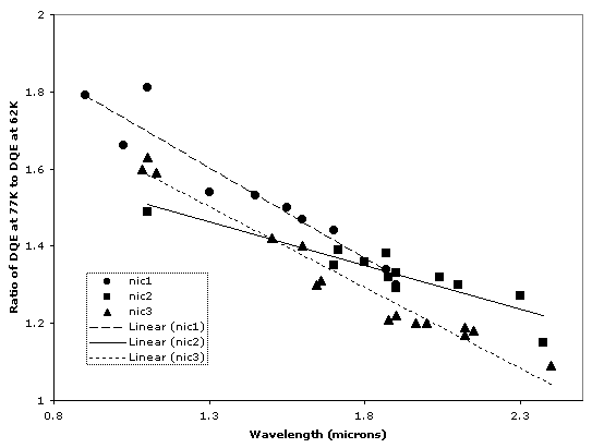Figure 7.7: Relative increase of the NICMOS DQE as a function of wavelength for operations at 77.1 K, compared to pre-NCS operations at 62 K.