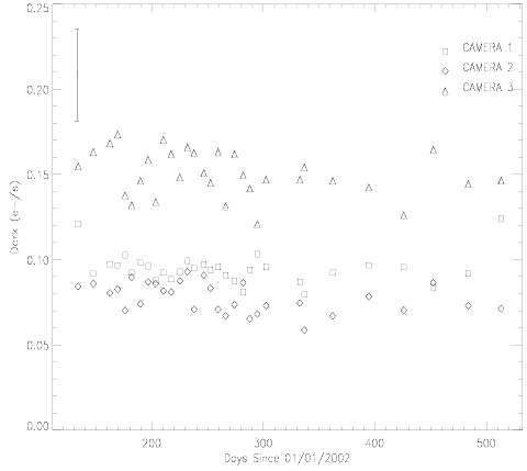 Figure 7.4: Results from the NICMOS dark current monitoring program following the installation of the NCS. Shown are the monthly (bi-monthly since January 2003) linear dark current measurements for all three NICMOS cameras. Note that the linear dark current is stable within the measurement errors (a typical error bar is shown in the upper left corner).