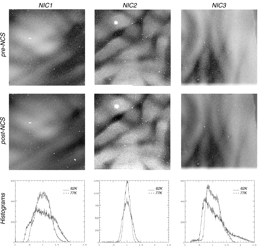 Figure 7.5: Normalized pre- and post-NCS flat field responses for NIC1 (left) through NIC3 (right) for F110W, F187W, and F113N, respectively. The images are inverted to better display the grot; therefore, the dark regions have higher QE. The color stretch is the same for both temperatures in each camera. The histograms show the "flattening" of the arrays at the higher temperature (narrower distribution). The decrease in the dynamic range between bright and faint targets is a direct result of the decreased well depth at the higher temperature.