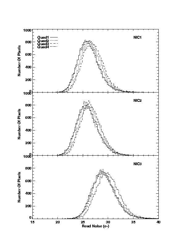 Each detector has four independent readout amplifiers, each of which reads a 128 × 128 quadrant. The four amplifiers of each detector generate very similar amounts of read noise. This is illustrated in Figure 7.8, which compares the pixel read noise distributions for the four quadrants of each NICMOS camera. The distributions for all quadrants are relatively narrow, with a FWHM of about 8 electrons, indicating that there are only few anomalously noisy pixels. The read noise is independent of temperature.