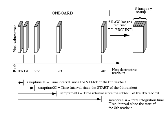 During the exposure, all pixels are first reset via three separate passes through the detector. The reset is immediately followed by a fourth pass through the detector, which non-destructively reads and stores the pixel values. This marks the beginning of the integration. The first array read will then be followed by one or more non-destructive readings of the detector. The last non-destructive readout marks the end of the integration. The total integration time is given by the difference in time between the first and the last array read.
