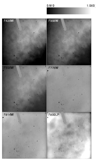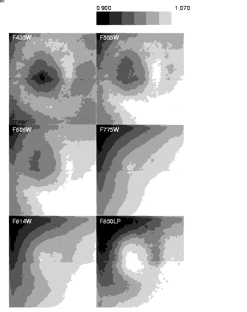 Figure 4.2 shows the corrected WFC ground flats for several broadband filters. Note: the 50 pixel gap seen in external images, between the top and bottom chips, is not shown here. Since the two CCDs were cut from the same Si wafer, and have undergone similar treatments, there is a significant continuity in the response across the gap.The central donut-like structure is wavelength dependent, where pixels in the central region are less sensitive than surrounding pixels in the blue F435W filter, for example, and more sensitive in the red F850LP filter. For further discussion of WFC flat fields, see ACS ISRs 2001-11, 2002-04, 2003-10, 2003-11, 2005-02, and 2005-09.