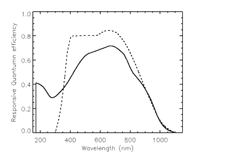 Figure 4.1: Responsive quantum efficiency of the HRC CCD (solid line) and WFC CCDs (dashed line).4.2.3 Quantum Efficiency Hysteresis