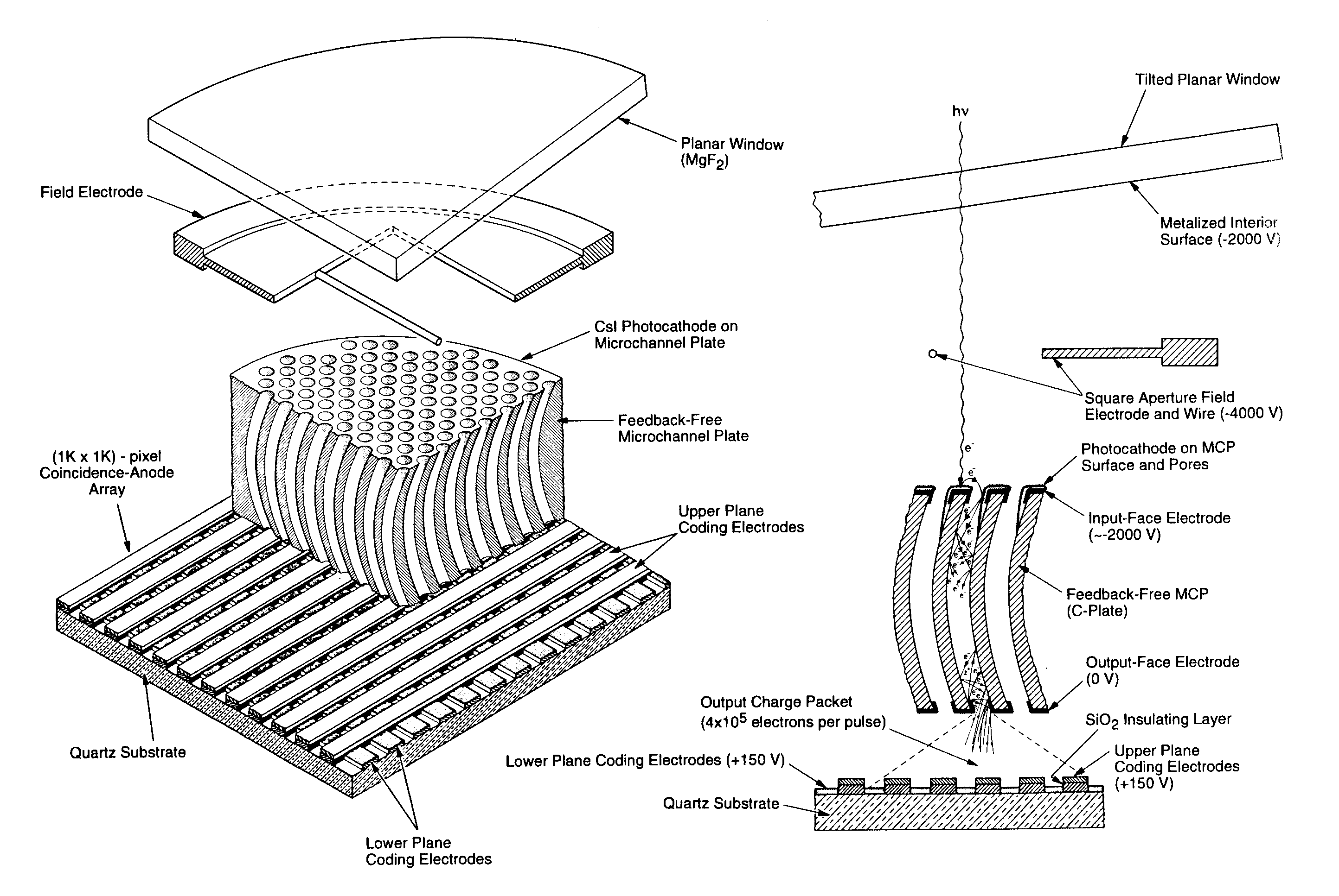 ACCUM) mode, in which a time-integrated image is produced. Unlike the STIS MAMAs, the ACS does not offer the high-resolution (2048 ¥ 2048) mode or time-tagged data acquisition. The primary benefits afforded by the STIS and ACS MAMAs, in comparison with previous HST UV spectroscopic detectors such as those in the GHRS and FOS, are high spatial resolution, two-dimensional imaging over a relatively large field of view, and low background for point sources.Figure 4.16: Design of the SBC MAMA.Figure 4.16 illustrates the design of the MAMA, which has an opaque CsI photocathode deposited directly on the face of the curved microchannel plate (MCP). Target photons strike the photocathode, liberating single photoelectrons which pass into the MCP. There they are multiplied to a pulse of ~4¥105 e–. The pulse is recorded by an anode array behind the photocathode, and detected by the MAMA electronics which rejects false pulses and determines the origin of the photon event on the detector.