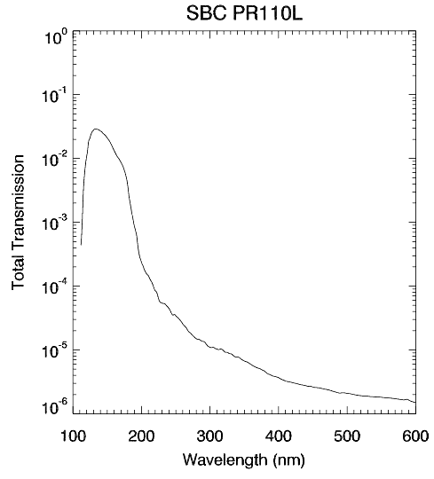 The total transmission curve for the SBC with the PR110L prism is shown in Figure 4.17. The peak photocathode response occurs at Lyman-a. Its spectral response is defined by the cutoff of the MgF2 window at 1150 Å at short wavelengths, and by the relatively steep decline of the CsI photocathode at long wavelengths.