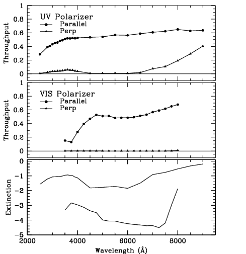 The visible polarizers clearly provide superior rejection for science in the 4500 Å to 7500 Å bandpass, while the UV optimized polarizers deliver lower overall rejection across a wider range from 2000 Å to 7500 Å. While performance of the polarizers begins to degrade at wavelengths longer than about 7500 Å, useful observations should still be achievable to approximately 8500 Å in the red. In this case, allowance for imperfect rejection of orthogonally polarized light should be made at the analysis stage.