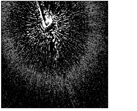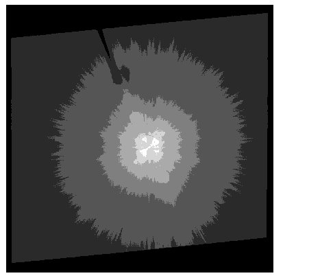 Figure 6.6: Geometrically corrected (29 arcseconds across) image of Arcturus observed in F814W behind the 1.8 arcseconds spot.This is a composite of short, medium, and long (280 seconds) exposures. The “bar” can be seen extending from the upper left to lower right. The shadows of the occulting finger and large spot can be seen against the scattered light background. Logarithmic intensity scale.