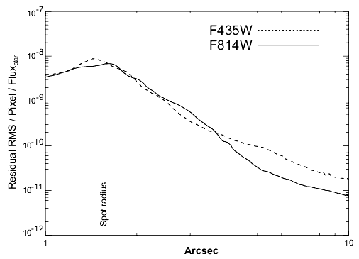 The best way to detect faint stellar or substellar companions is to use roll subtraction to avoid color differences between the target and reference PSFs. This technique also provides duplicate observations that make it easier to verify true companions from noise. It is best to roll the telescope between visits and repeat the image sequence in a new orbit. This way, you can better match the breathing cycle of the telescope than if you rolled the telescope in the middle of an orbital visibility window. You can force this to happen by selecting both orientation and time-sequencing constraints in the visit special requirements. Remember that the off-spot coronagraphic PSF is somewhat broader than the normal HRC PSF, which may influence your assumed signal-to-noise ratio. Off-spot PSF models can be generated with the Tiny Tim PSF software. You can estimate the residual background noise level using Figure 6.13.