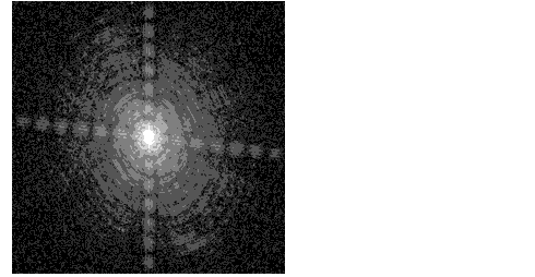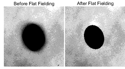 Figure 6.5: Region of the Orion Nebula around the D = 1.8 arcseconds spot.(Left) The spot edge appears blurred due to vignetting. The image has not been geometrically corrected. (Right) The same region after the image has been corrected by dividing the flat field. The interior of the spot has been masked.