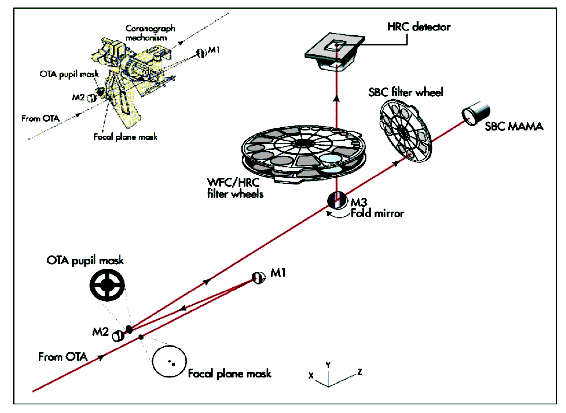 Figure 6.2: Schematic layout of the ACS HRC coronagraph.The upper left inset shows a schematic of the coronagraph mechanism that can be flipped in-and-out of the HRC optical path.