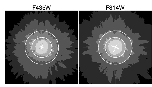 Figure 6.3: Simulated point spread functions at the plane of the occulting spots through filters F435W and F814W,shown with logarithmic intensity scaling.The elliptical, cross-shaped patterns in the cores are due to astigmatism at the off-axis ACS aperture. The astigmatism is corrected later by the ACS optics. The sizes of the two occulting spots (D=1.8 arcseconds and 3.0 arcseconds) are indicated by the white circles.