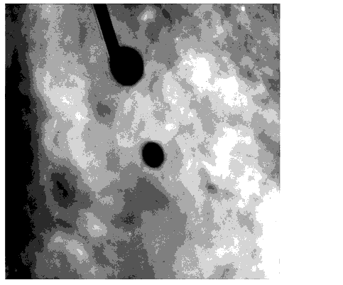 Figure 6.4: Region of the Orion Nebula imaged with the coronagraph and filter F606W.The silhouettes of the occulters can be seen against the background nebulosity. The 1.8 arcsecond spot is located at the center and the 3.0 arcsecond spot towards the top. The finger is aligned along one edge of the larger spot. This image has not been corrected for geometric distortion, so the spots appear elliptical.