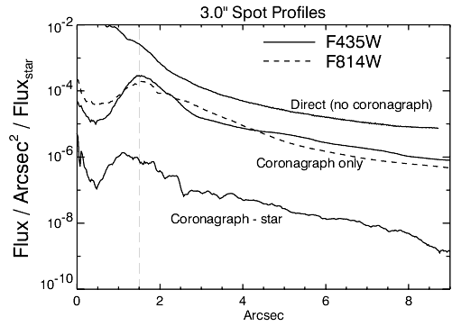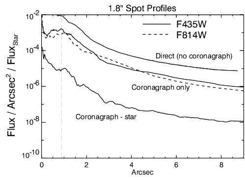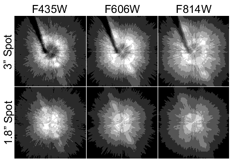 The measured radial surface brightness profiles (Figure 6.8) show that the coronagraph is well aligned and operating as expected. The light diffracted by the HST obscurations is suppressed below the level of the scattered light – there are no prominent diffraction spikes, rings, or ghosts beyond the immediate proximity of the spots. At longer wavelengths (l > 6000 Å) the diffraction spikes appear about as bright as the residual scattered light because the diffraction pattern is larger and not as well suppressed by the coronagraph. The spikes are more prominent in images with the large spot than the small one because the Lyot stop is not located exactly in the pupil plane but is slightly ahead of it. Consequently, the beam can “walk” around the stop depending on the field angle of the object. Because the large spot is at the edge of the field, the beam is slightly shifted, allowing more diffracted light to pass around the edges of the stop.