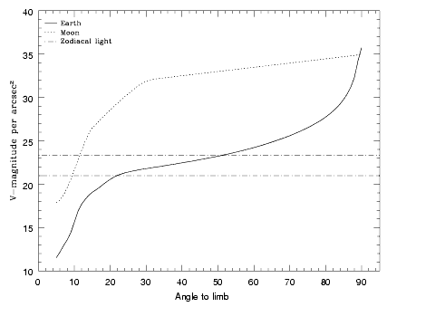 On the other hand, Earthshine varies strongly depending on the angle between the target and the bright Earth limb. The variation of the Earthshine as a function of limb angle from the sunlit Earth is shown in Figure 9.2. This figure also shows the contribution of the moon, which is typically much smaller than the zodiacal contribution, for which the upper and lower limits are shown. For reference, the limb angle is approximately 24× when the HST is aligned toward its orbit pole (i.e., the center of the CVZ), this limb angle corresponds to "Extremely High" Earthshine. The Earthshine contribution shown in Figure 9.1 and Table 9.7 corresponds to a limb angle of 30×, High Earthshine.