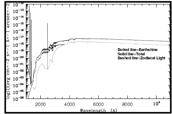 Figure 9.1: High sky background intensity as a function of wavelength.The zodiacal contribution (ZL) is at ecliptic latitude and longitude of 30×,180×, and corresponds to mv = 22.1 per square arcseconds. The Earthshine (ES) is for a target which is 38× from the limb of the sunlit Earth. Use Figure 9.2 to estimate background contributions at other angles. The daytime geocoronal line intensities are in erg/cm2/ second/arcseconds2 (see Table 9.6).