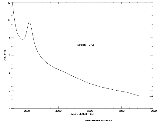 Av /E(B–V) values for our galaxy, taken from (Seaton, MNRAS, 187, 73P, 1979). Large variations about the average are observed (Witt, Bohlin, Stecher, ApJ, 279, 698, 1984).Extinction curves have a strong metallicity dependence, particularly in the UV wavelengths. Sample extinction curves can be seen in Koornneef and Code, ApJ, 247, 860 1981 (LMC); Bouchet et al., A&A, 149, 330 1985 (SMC); and Calzetti, Kinney and Storchi-Bergmann, ApJ, 429, 582, 1994, and references therein. At lower metallicities, the 2200 Å bump which is so prominent in the galactic extinction curve disappears; and Av/E(B–V) may increase monotonically at UV wavelengths.